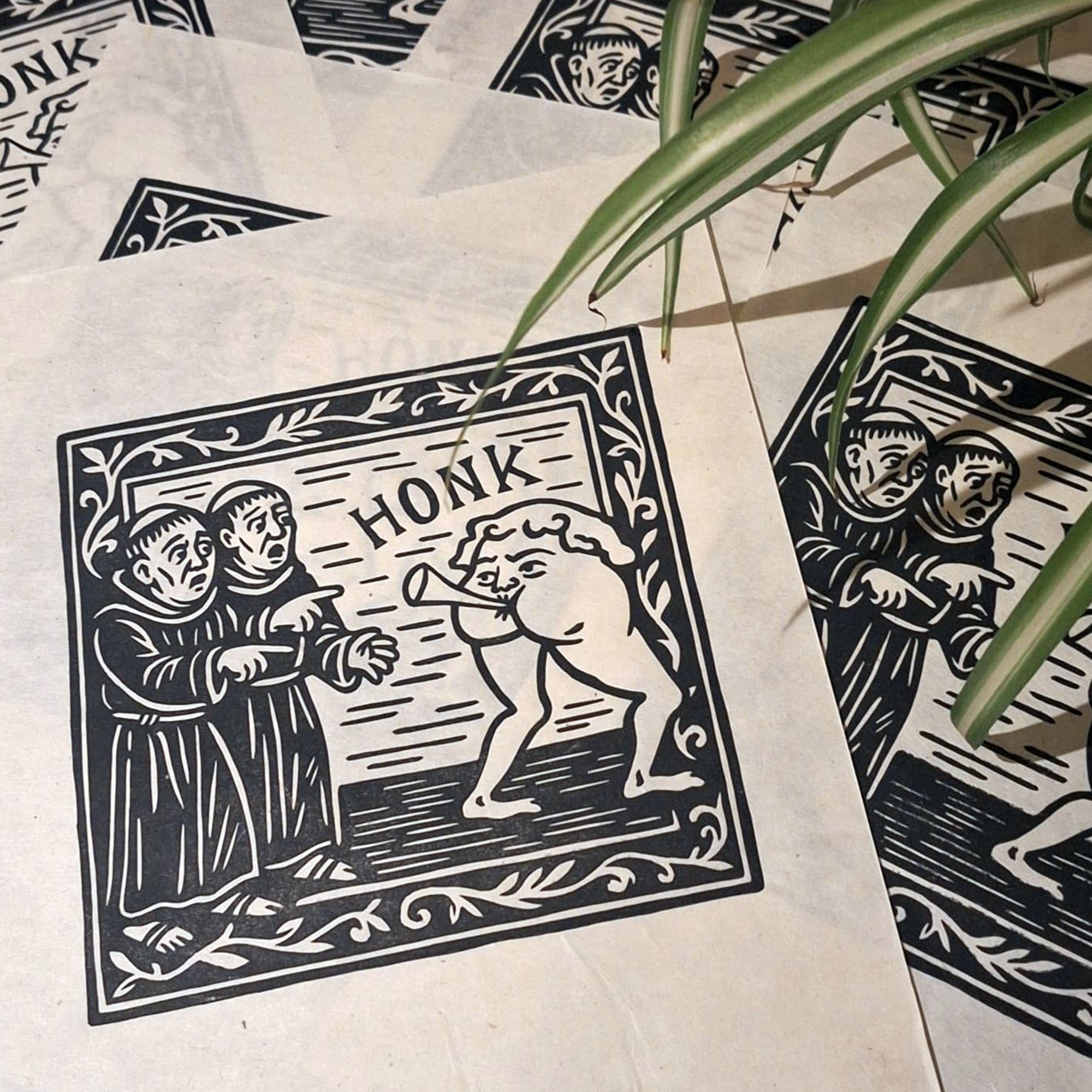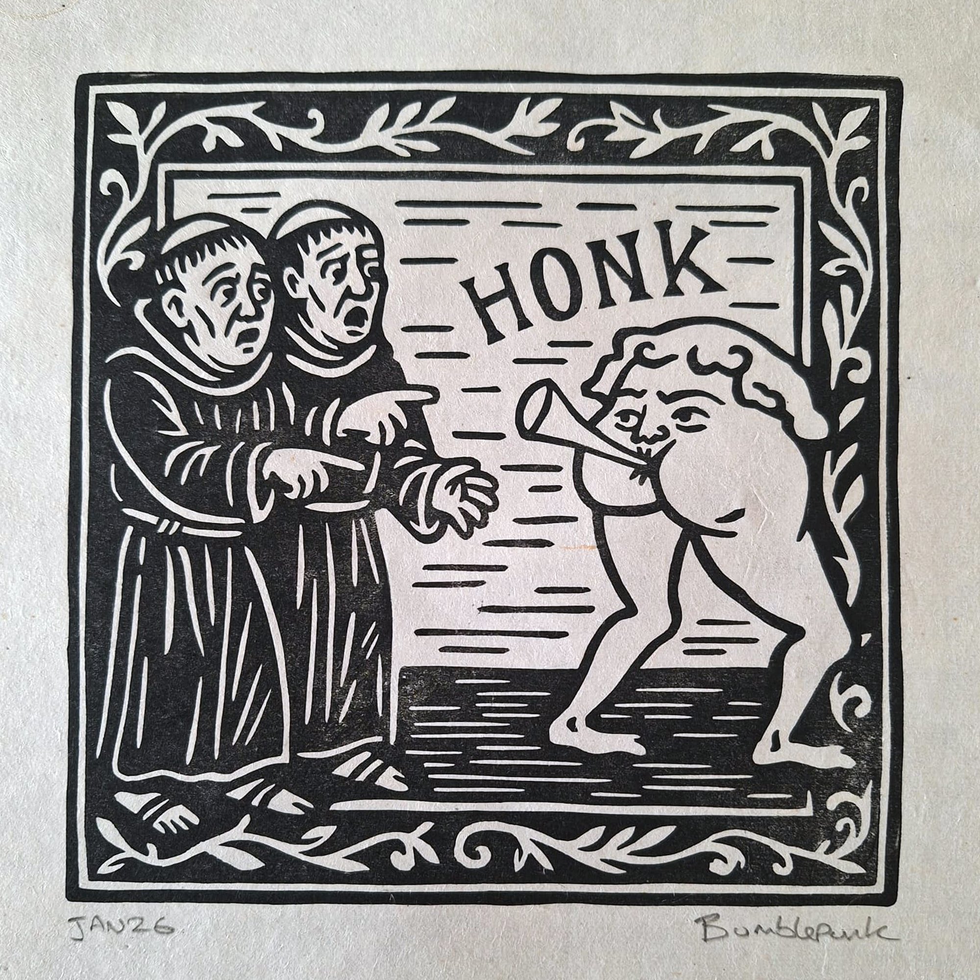 One unframed A4 linocut print of two shocked friars and a rude little bumtrumpet
