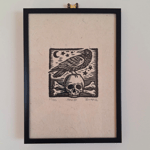 One A4 linocut print of a crow perched on a skull, inspired by memento mori bookplates