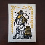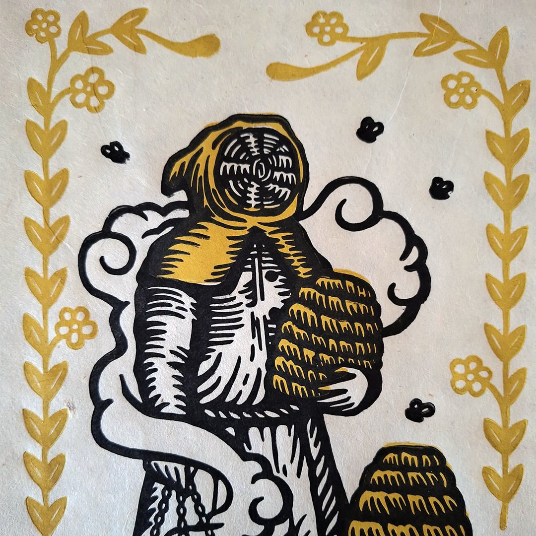 A brand new print for 2026, meet the medieval beekeeper - this enigmatic figure can be seen wandering around the village shrouded in a dense blanket of mysterious mist. Beekeeping was one of the most important jobs in medieval life, not only nurturing the pollinators that would help the crops to grow, but also liaising with the tiny creatures that many believed to hold supernatural powers!