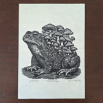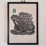 One unframed A4 linocut print of a grumpy toad with mushrooms